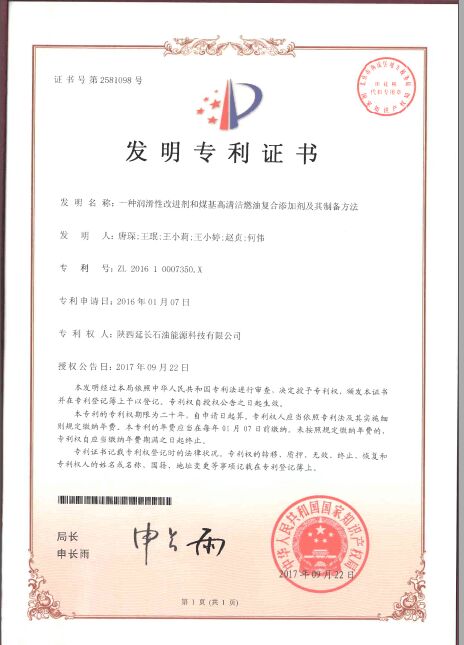 近日,我公司申报的“一种润滑性改进剂和煤基高清洁燃油复合添加剂及制备方法”,通过了中华人民共和国国家知识产权局审核,授予发明专利证书,专利号:201610077350. X。